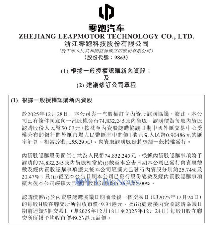 12月29日消息,零跑汽车于2025年12月28日与一汽股权投资签署内资股认购协议,拟以每股人民币50.03元(相当于港币55.29元)的价格向一汽股权发行7,483.2万股内资股,总金额为人民币37.44亿元。